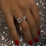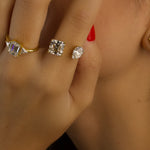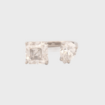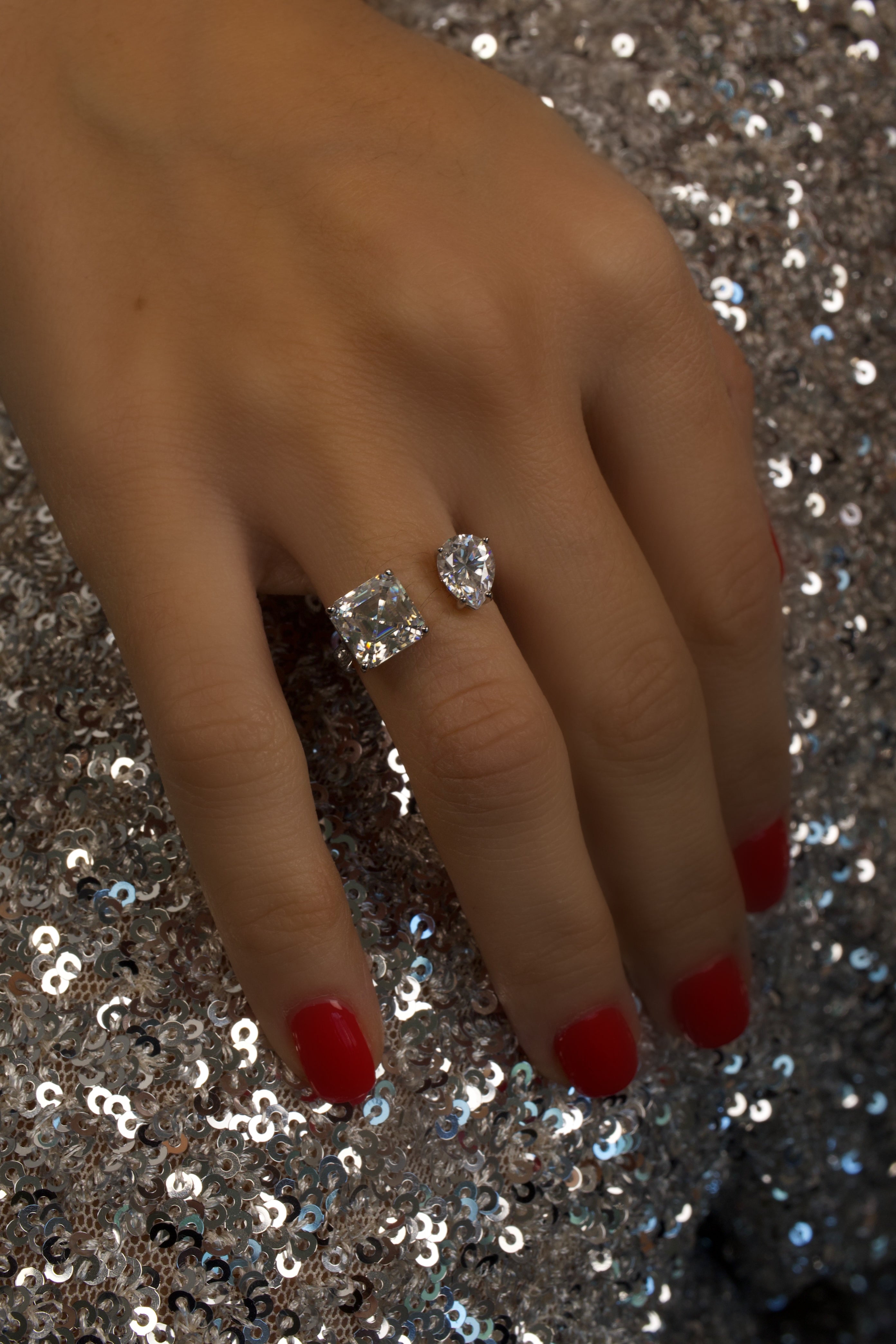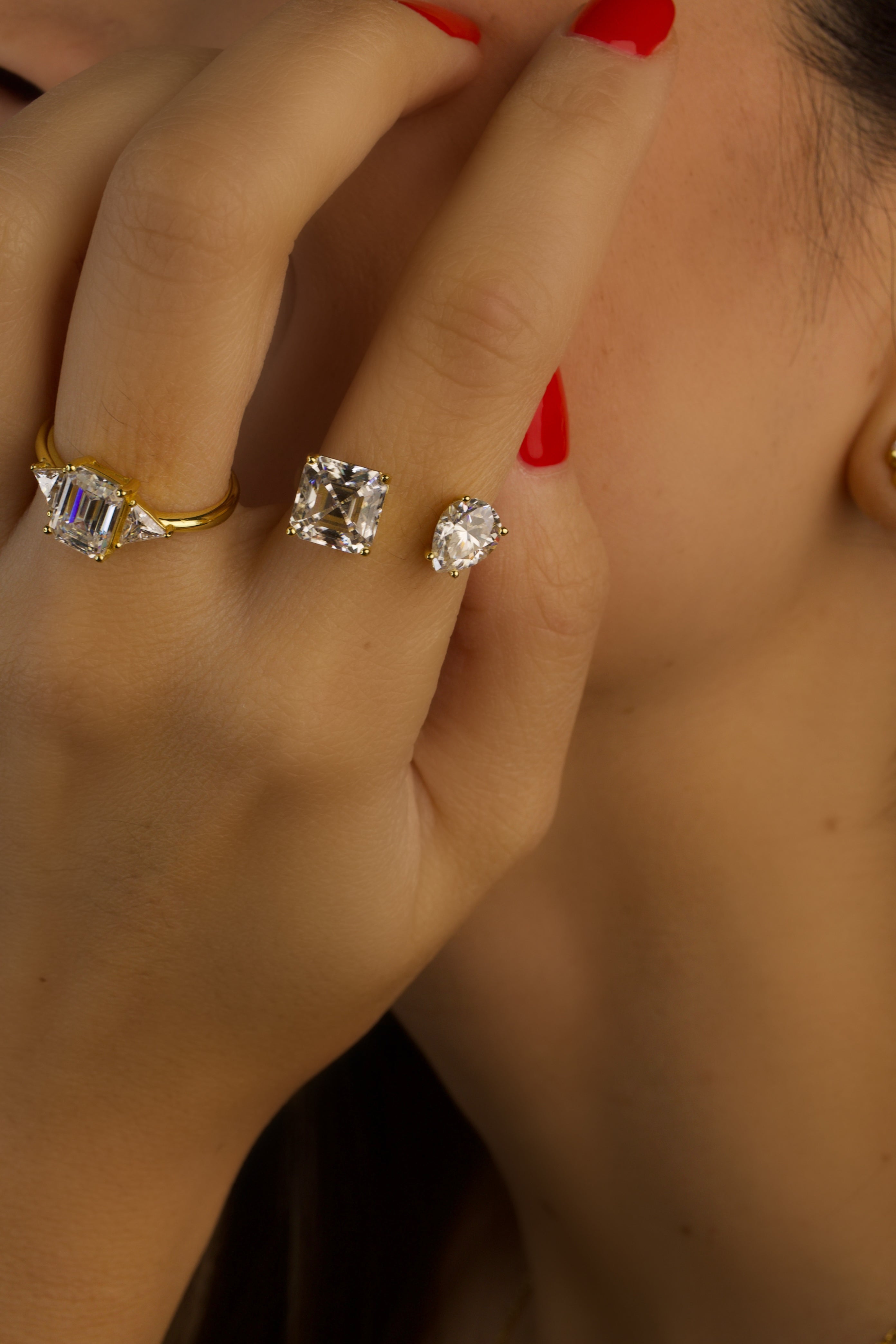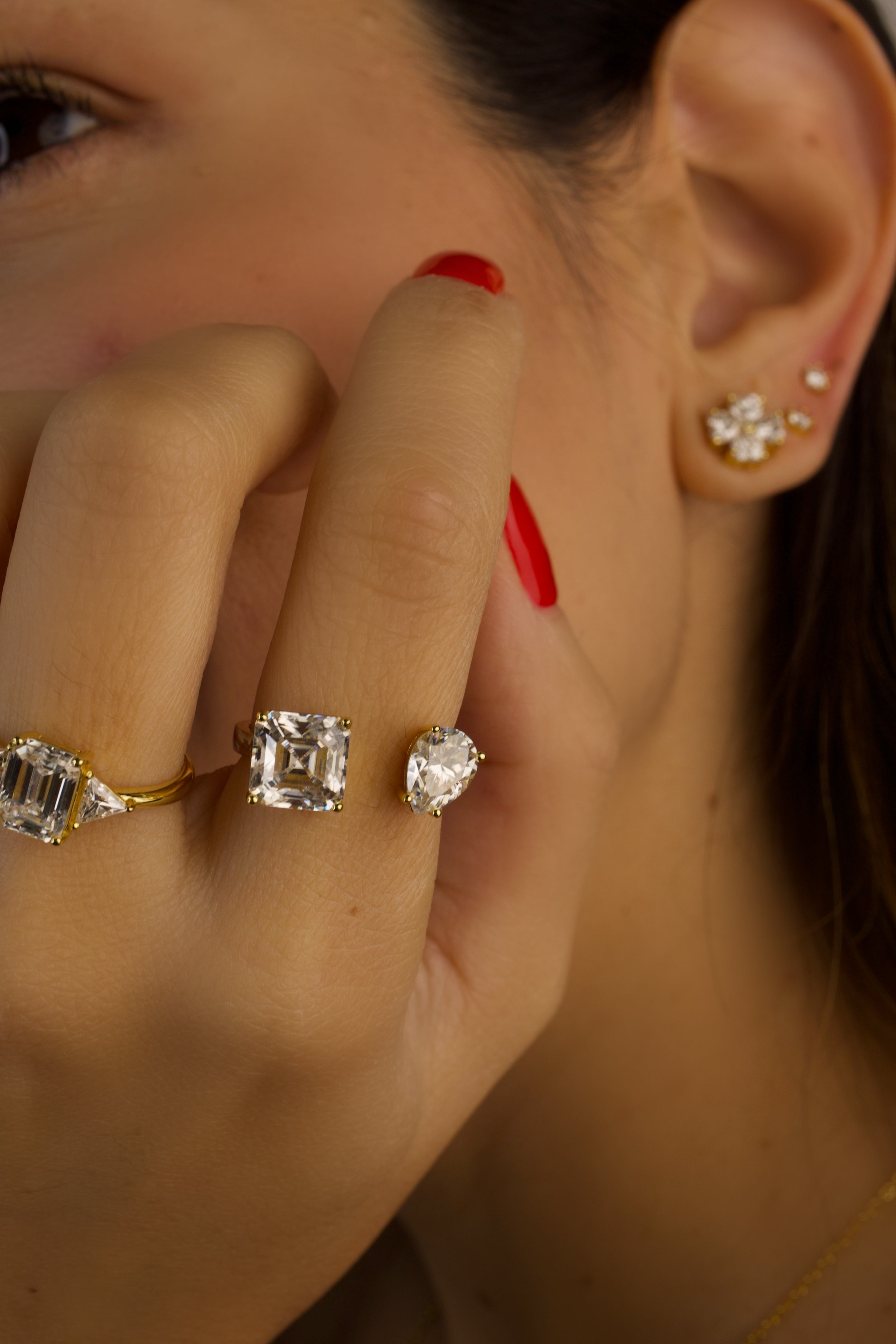 Este anel elegante é fabricado em prata 925 e possui um acabamento premium com cortes em formato princess e pear em moissanite premium. Com banho duplo de ouro 14K ou ródio, garantindo maior durabilidade, é perfeito para quem possui alergia, pois é livre de níquel.