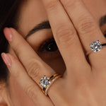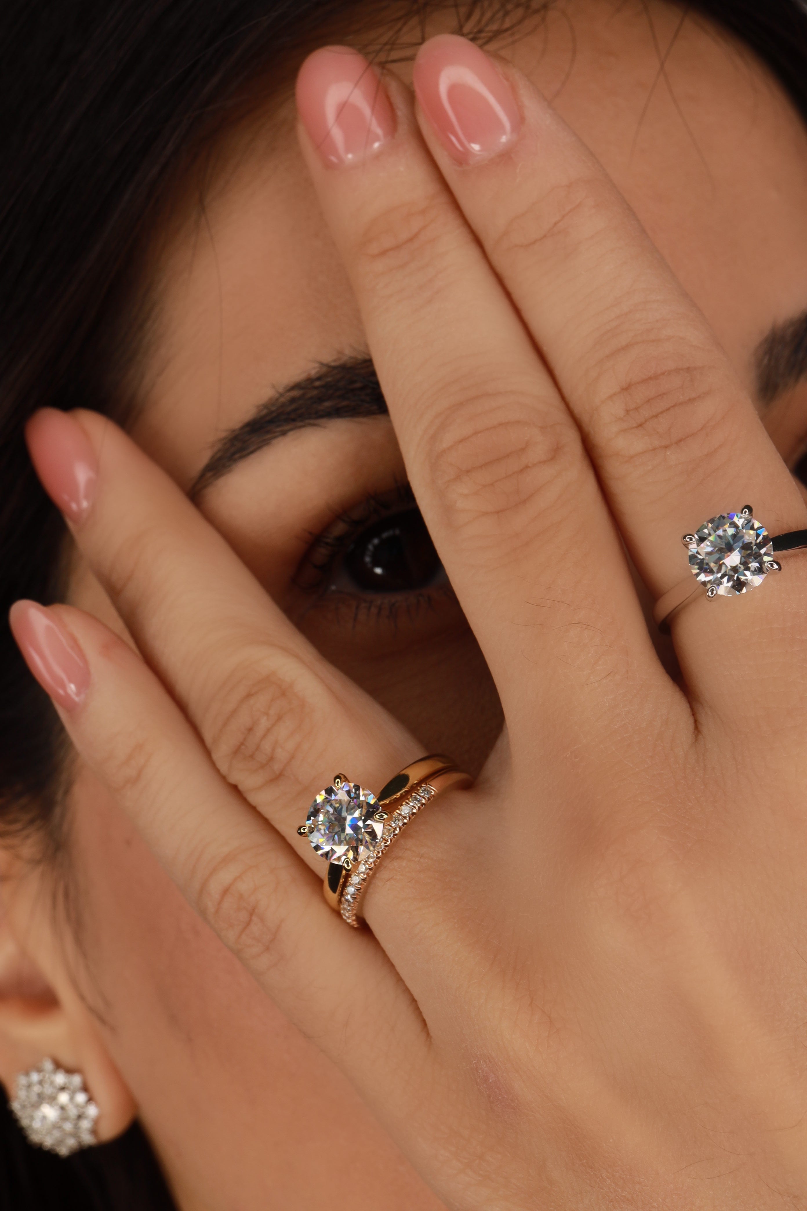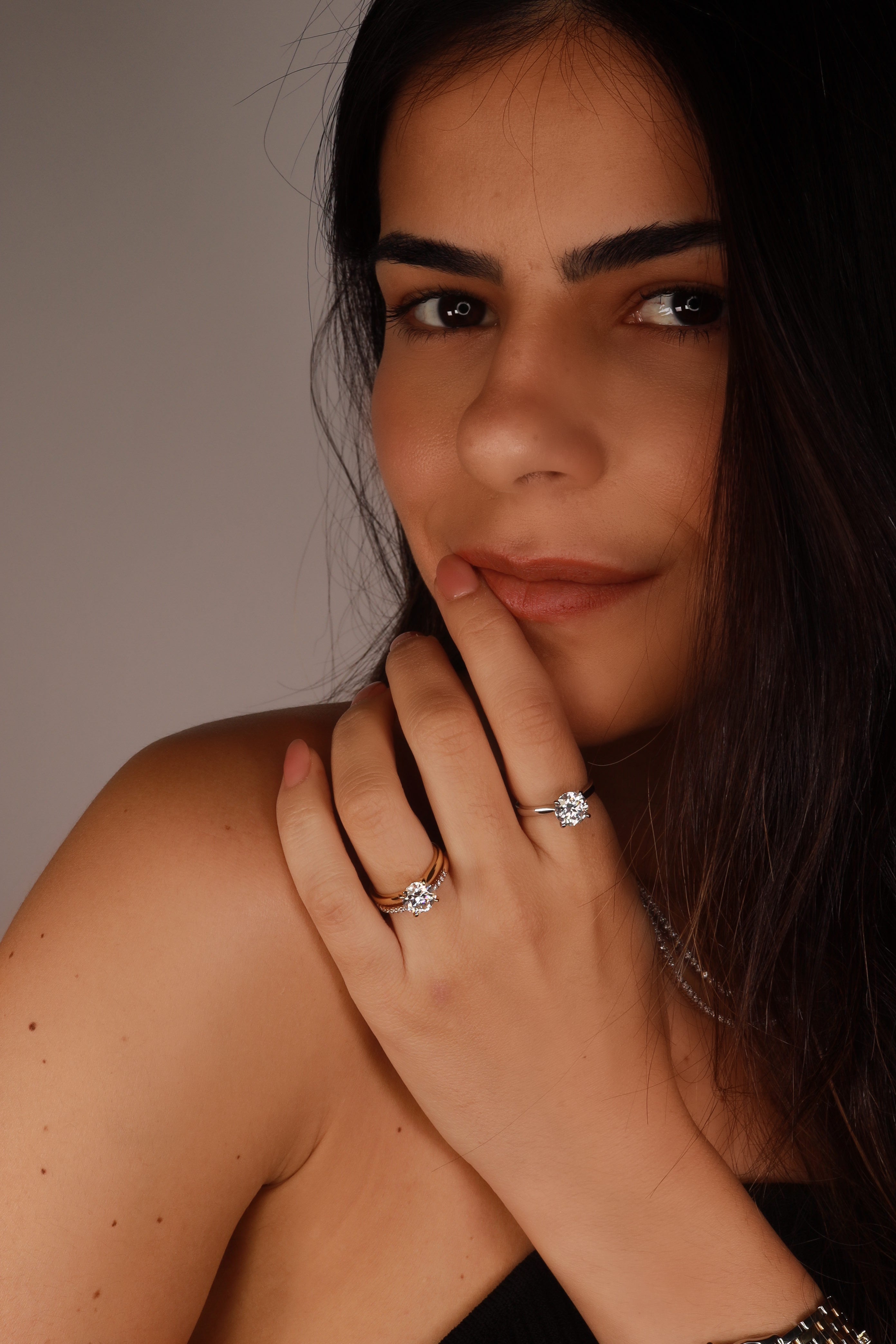 Sinta-se elegante e sofisticado com o nosso anel "The Must Have". Com um magnífico Moissanite de 1,25 quilates em corte redondo, montado em quatro pinos, este solitário é uma joia de tirar o fôlego. Fabricado em prata 925 e banhado em ouro 14K ou ródio para maior durabilidade. Livre de níquel e hipoalergênico.
