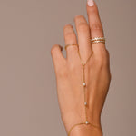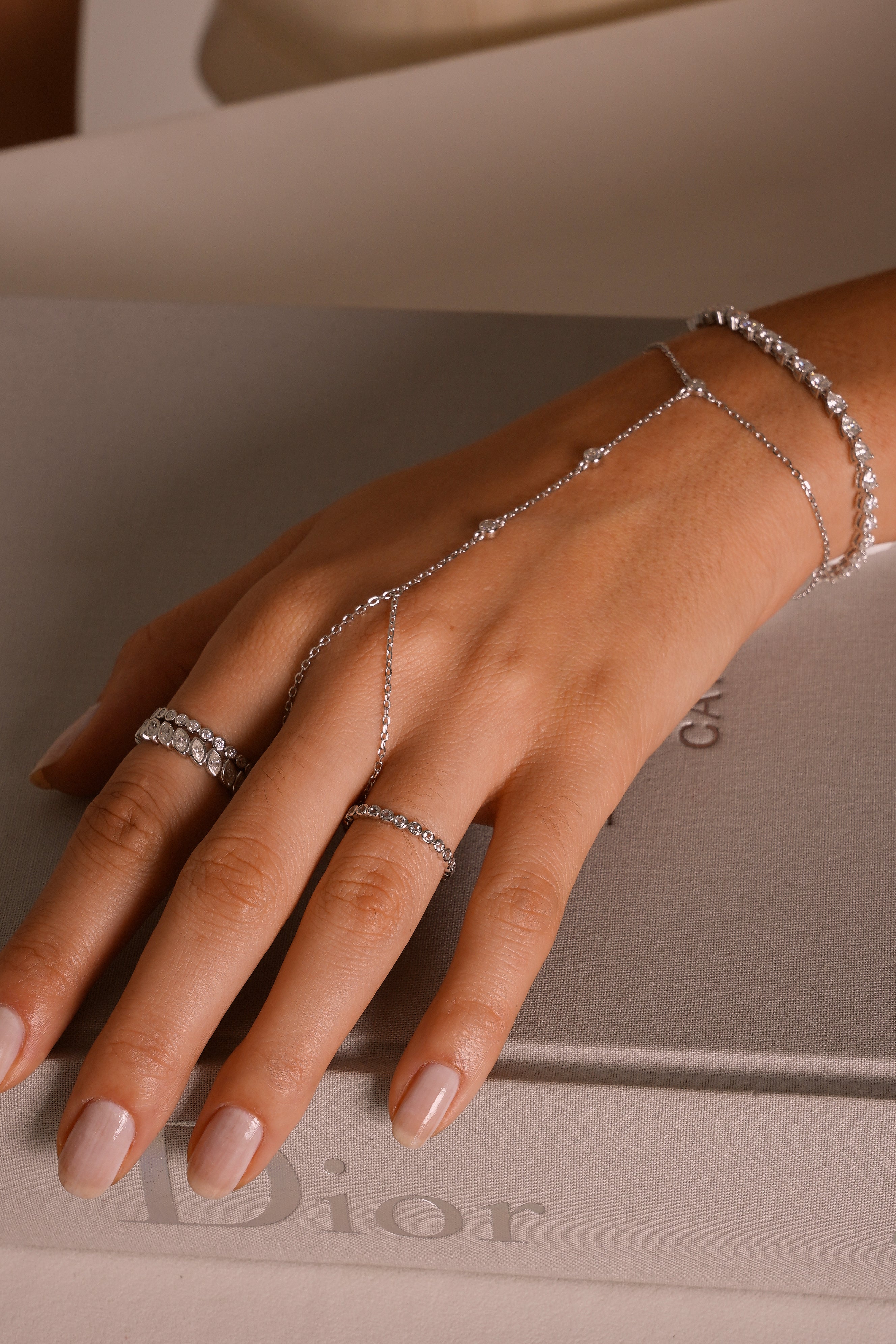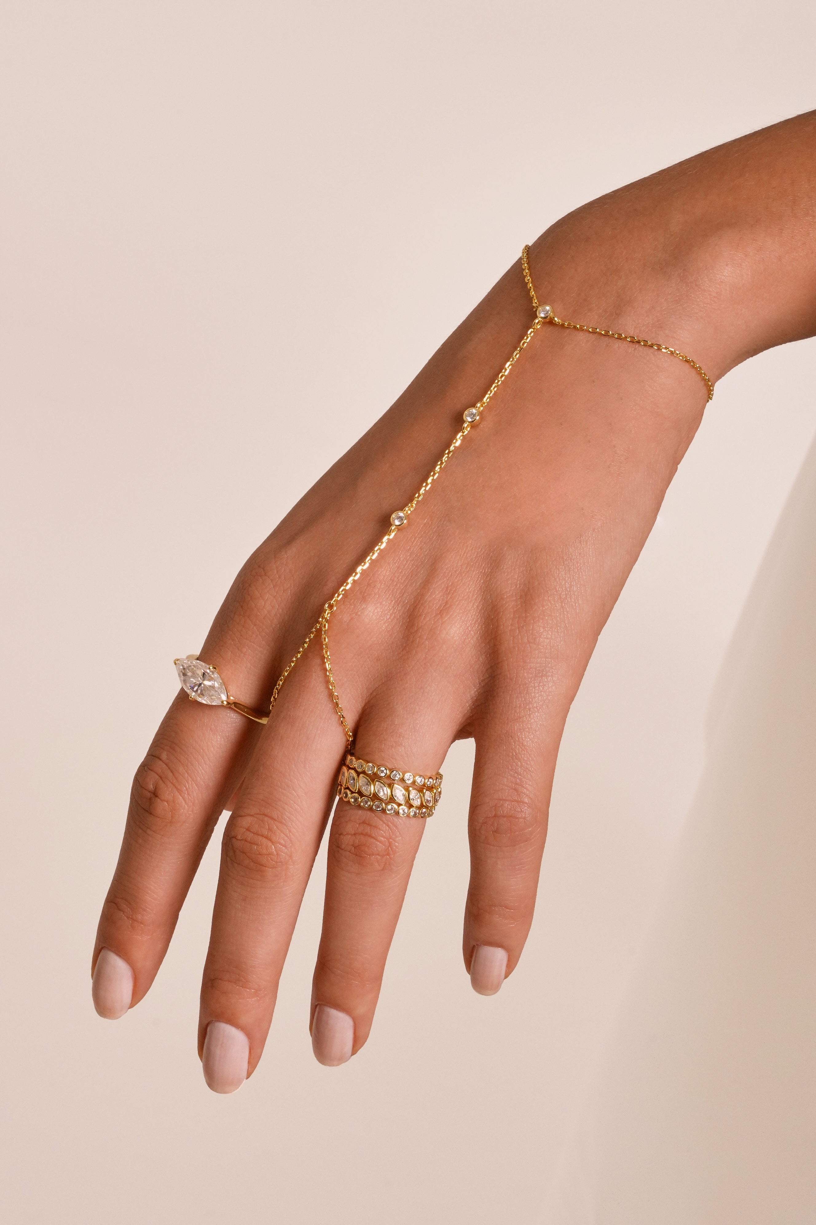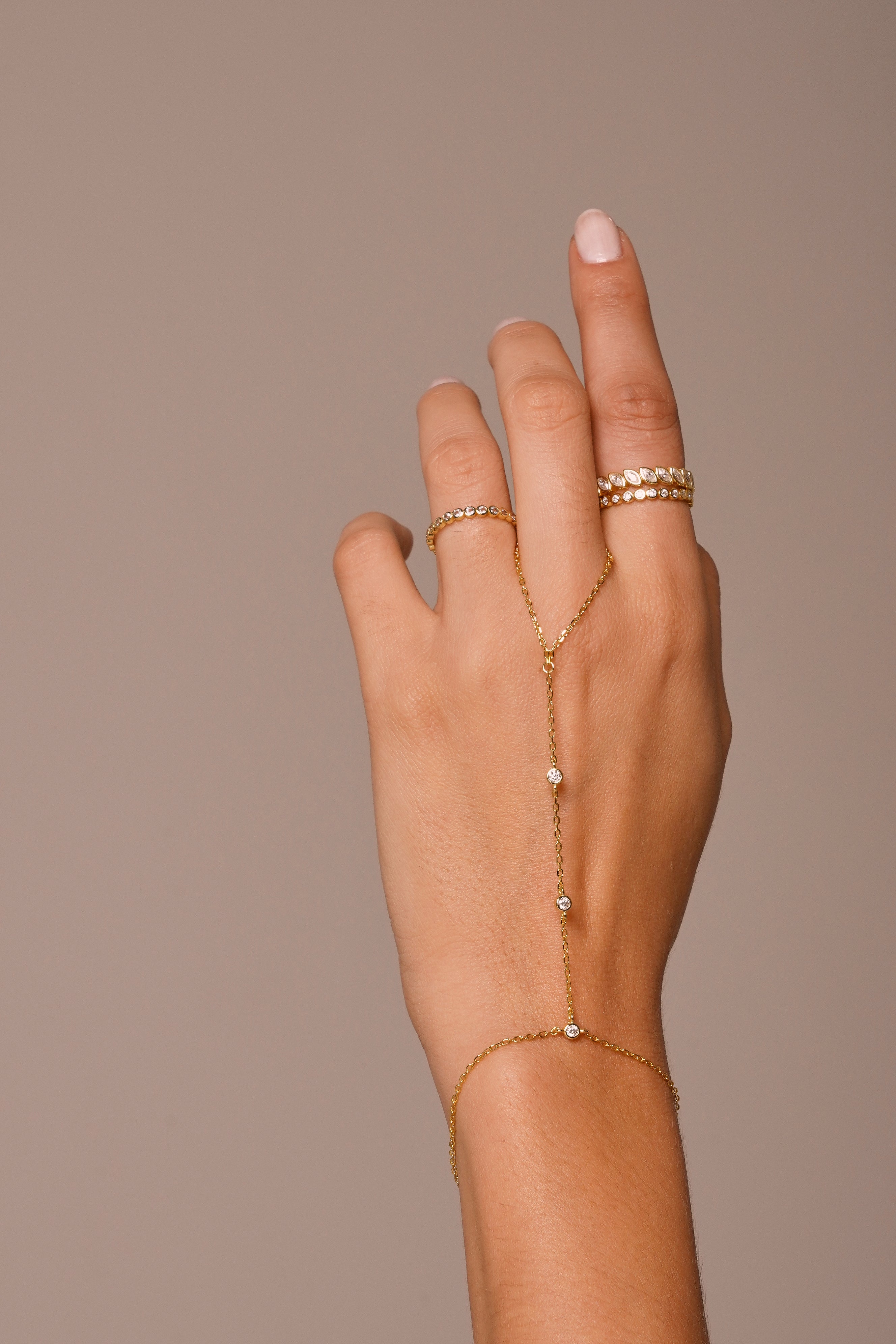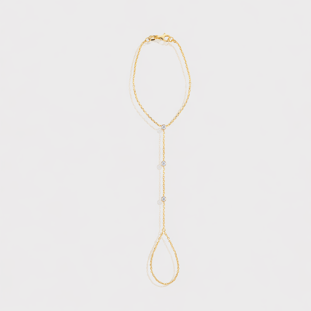 Design: Silhueta moderna estilo hand-chain que conecta uma pulseira clássica a um aro delicado para o dedo — minimalista e marcante, perfeita para ocasiões especiais ou produções sofisticadas do dia a dia
