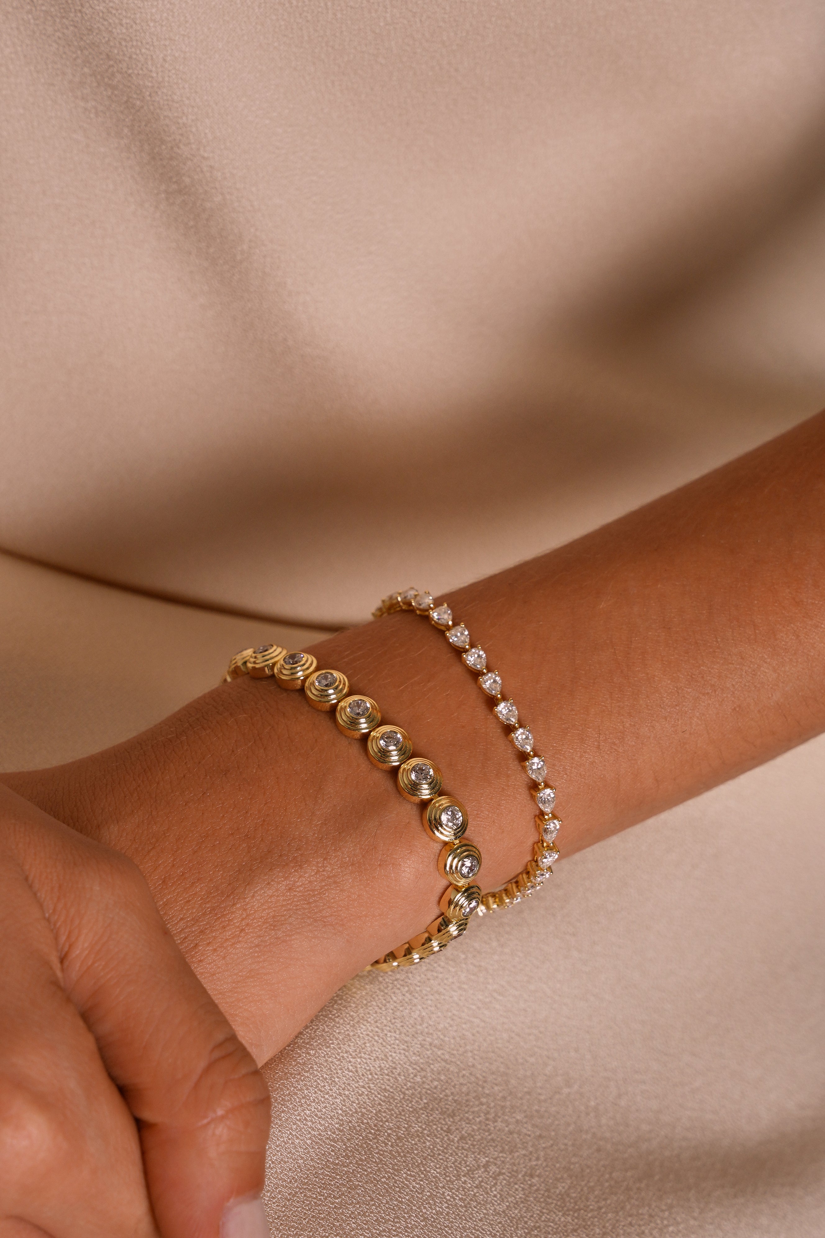 Design: Silhueta slim estilo tennis com pedras em formato pera que criam um efeito gracioso de “chuva” — perfeita para usar sozinha ou combinada com outras pulseiras