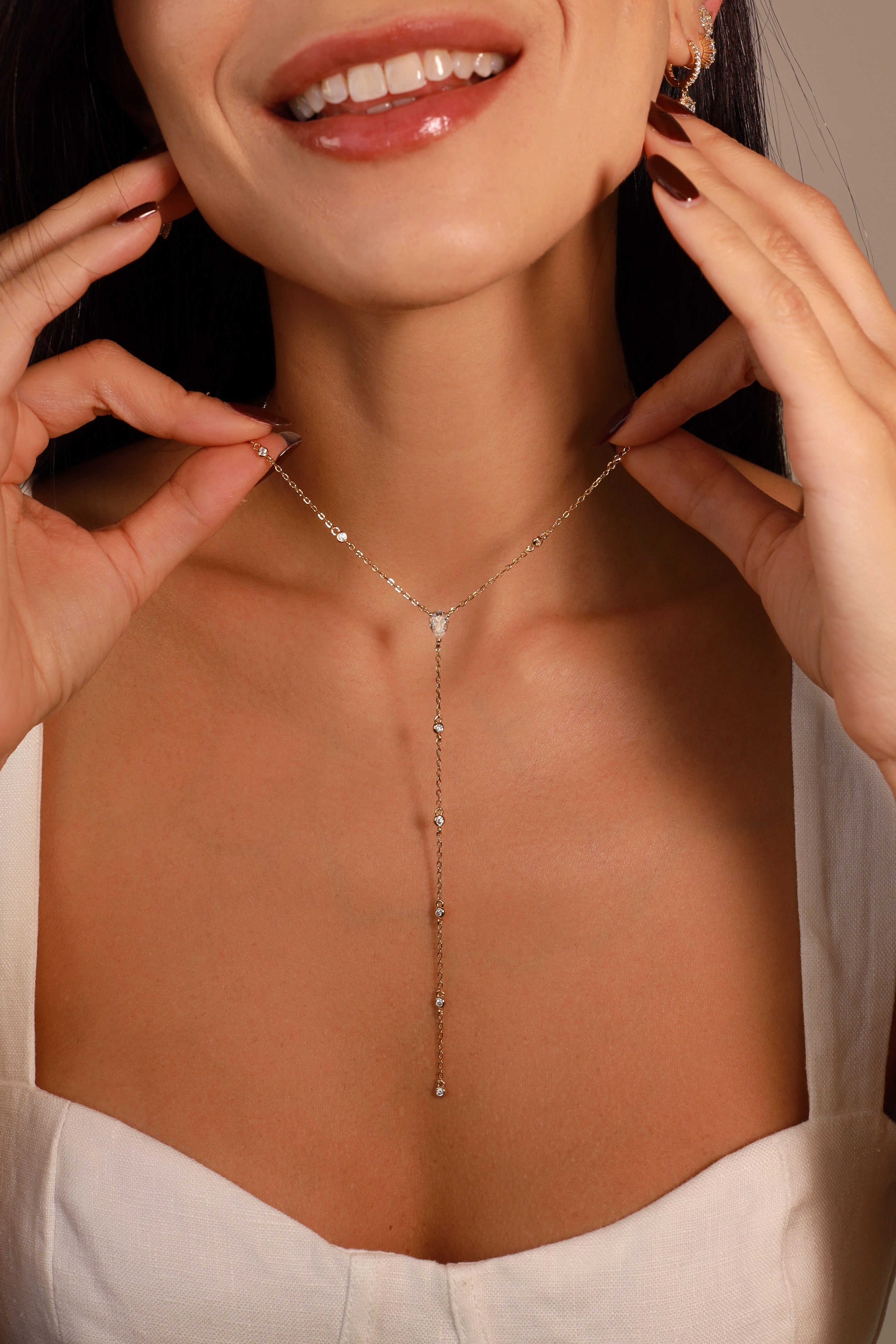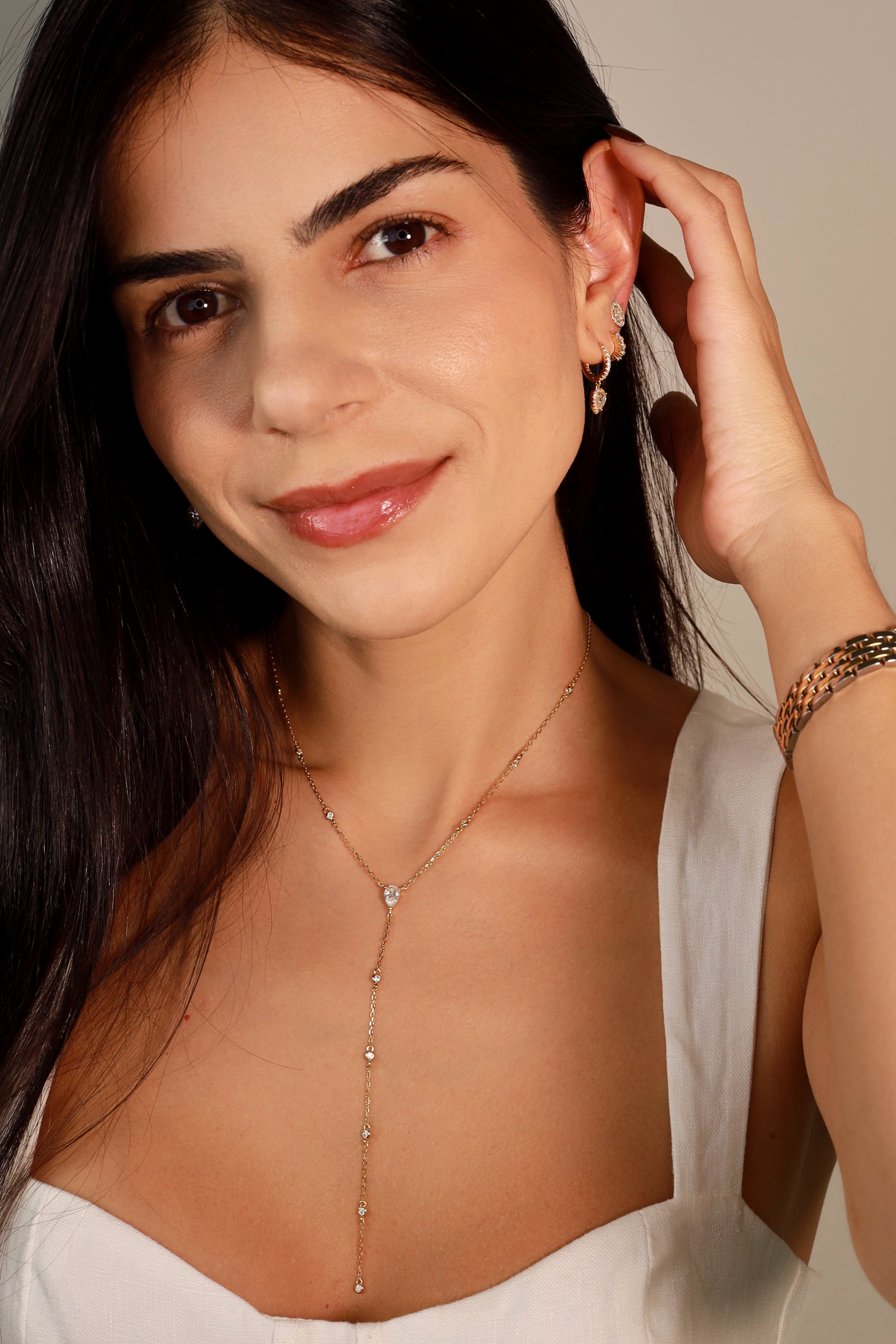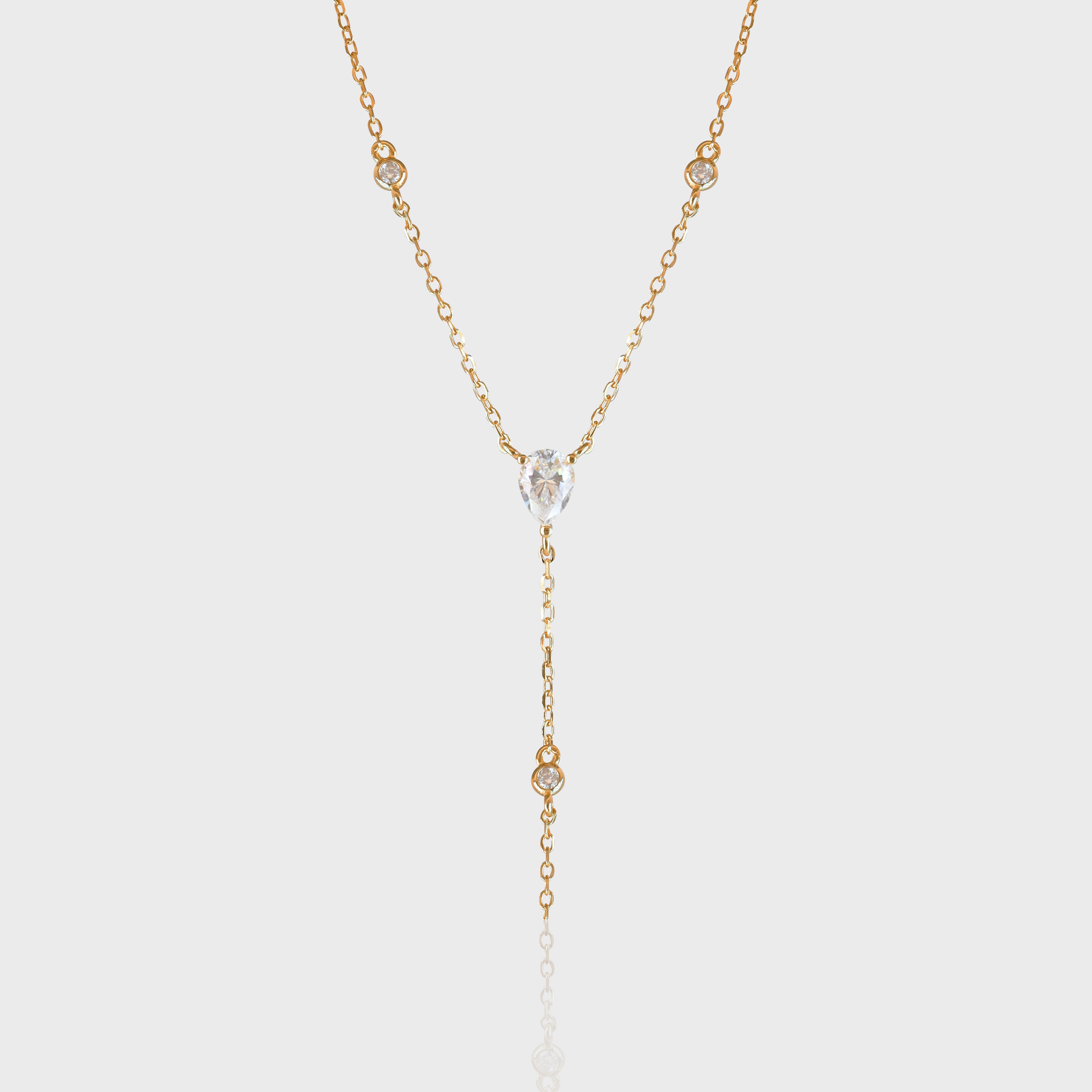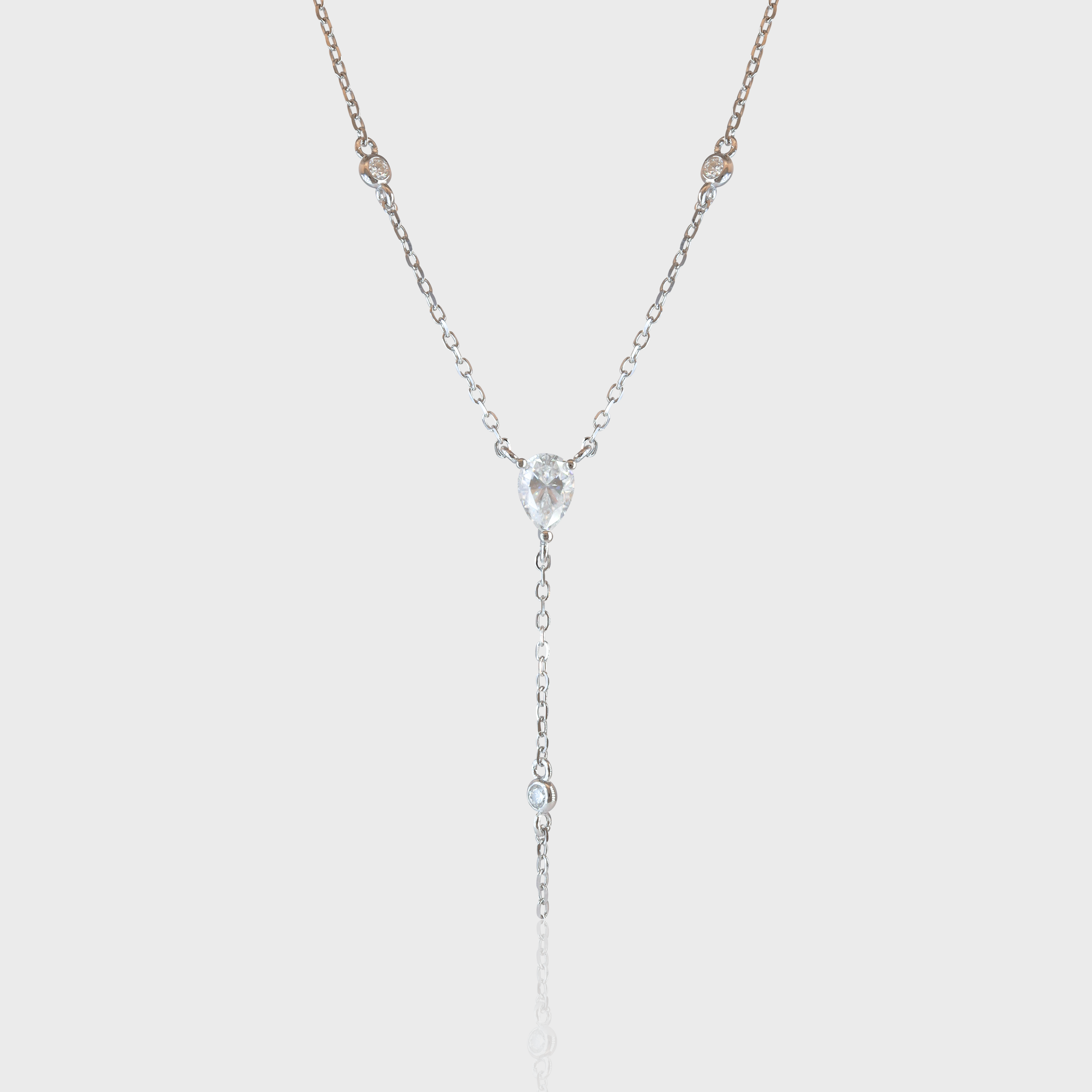 Descubra o fascínio do The Charm Tie Necklace, uma peça refinada que adiciona elegância a qualquer roupa. Apresentando uma pedra moissanite central em forma de pêra e delicados detalhes ao longo da corrente, este colar de 37cm, com um extensor adicional de 5cm, permite um uso versátil e estilo. Disponível em banho de ouro e ródio.