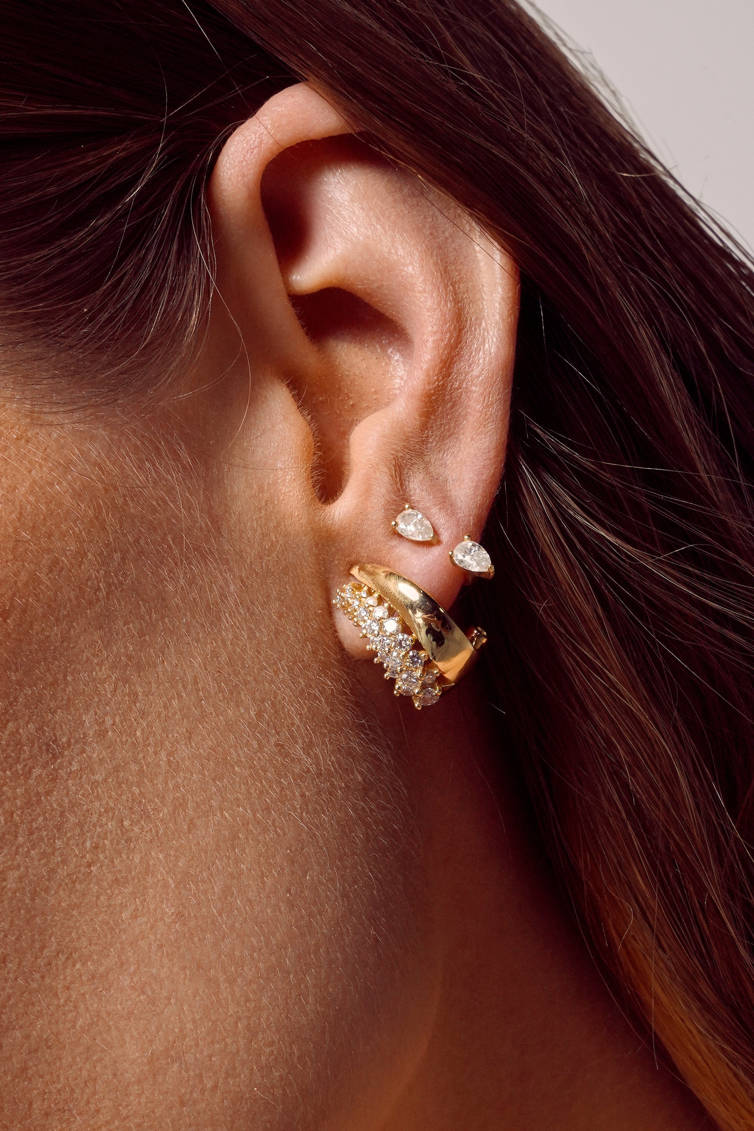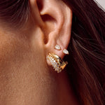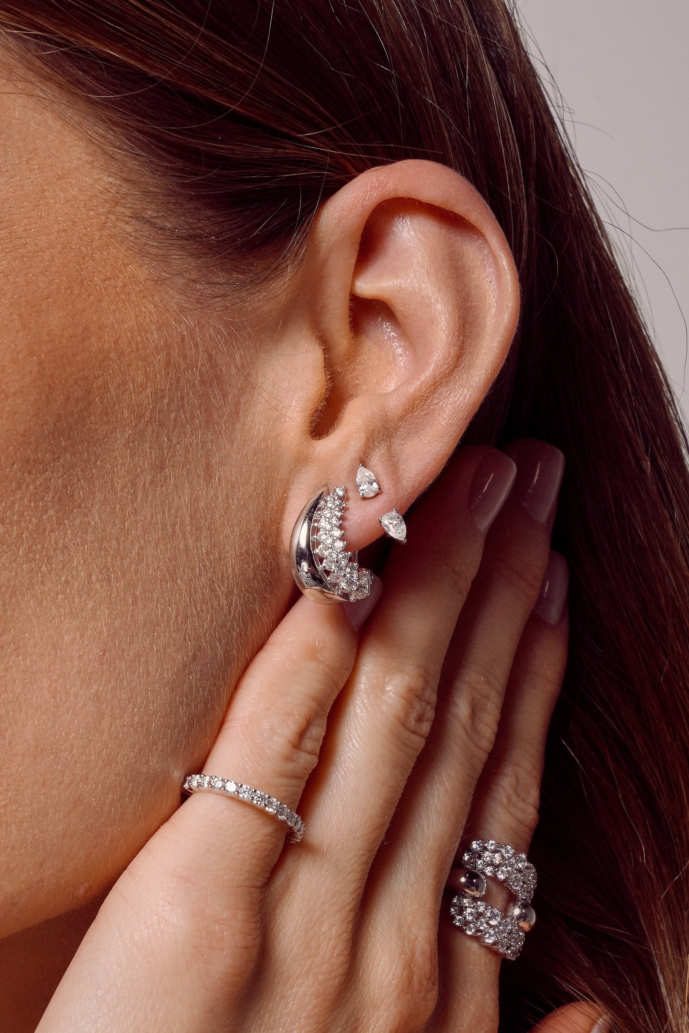 Elegantes, esculturais e intensamente radiantes — os Brincos Majestic Moissanite unem curvas marcantes e o brilho sofisticado da moissanite para um visual instantaneamente elevado. Produzidos em Prata 925 e finalizados com banho de ouro 14K ou ródio, este design apresenta uma silhueta de 1,1 × 1,8 cm que combina um arco polido e suave com uma fileira de moissanites de alta qualidade, criando uma harmonia impactante entre brilho e dimensão.