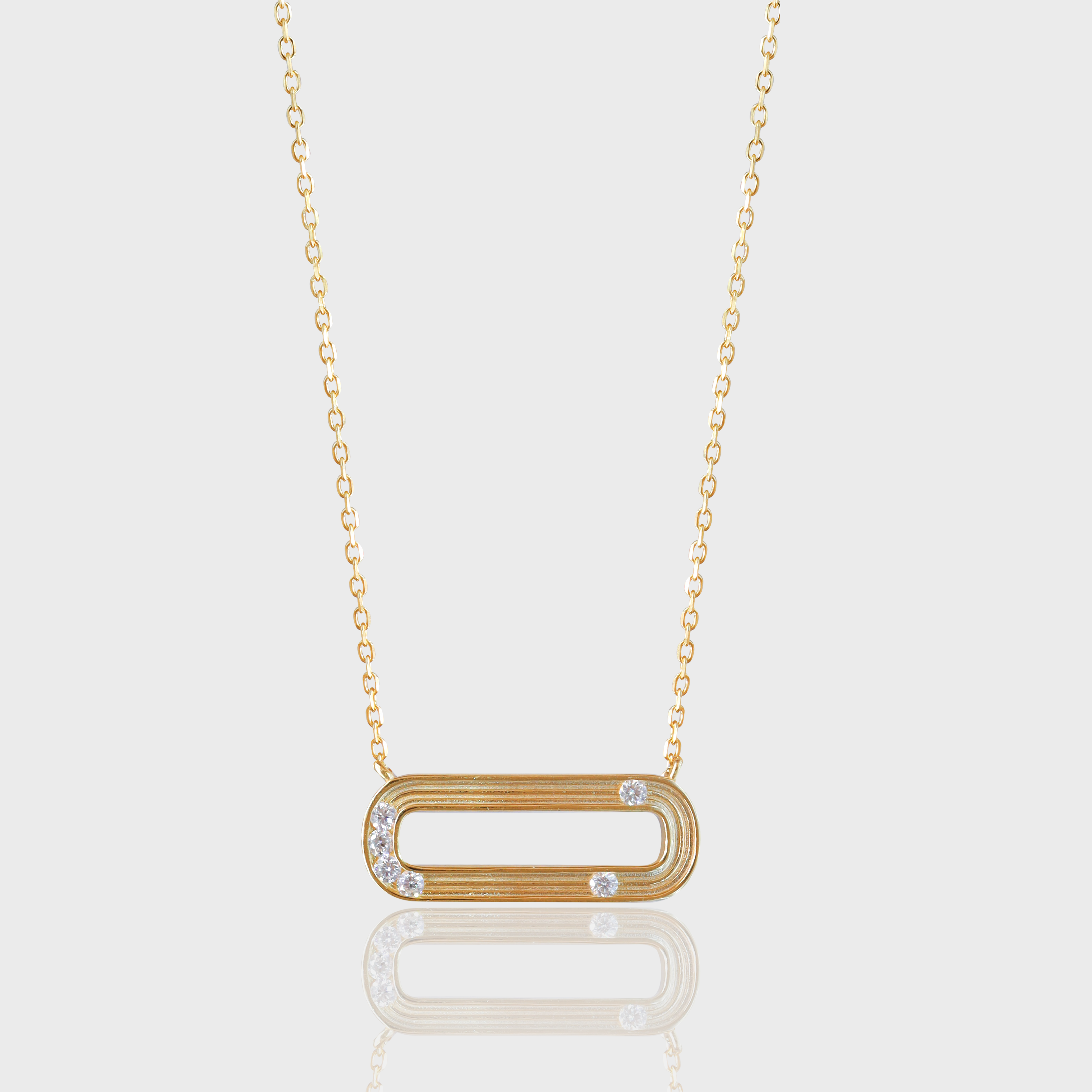 Pingente: Silhueta alongada e moderna, com moissanites cravadas em bezel