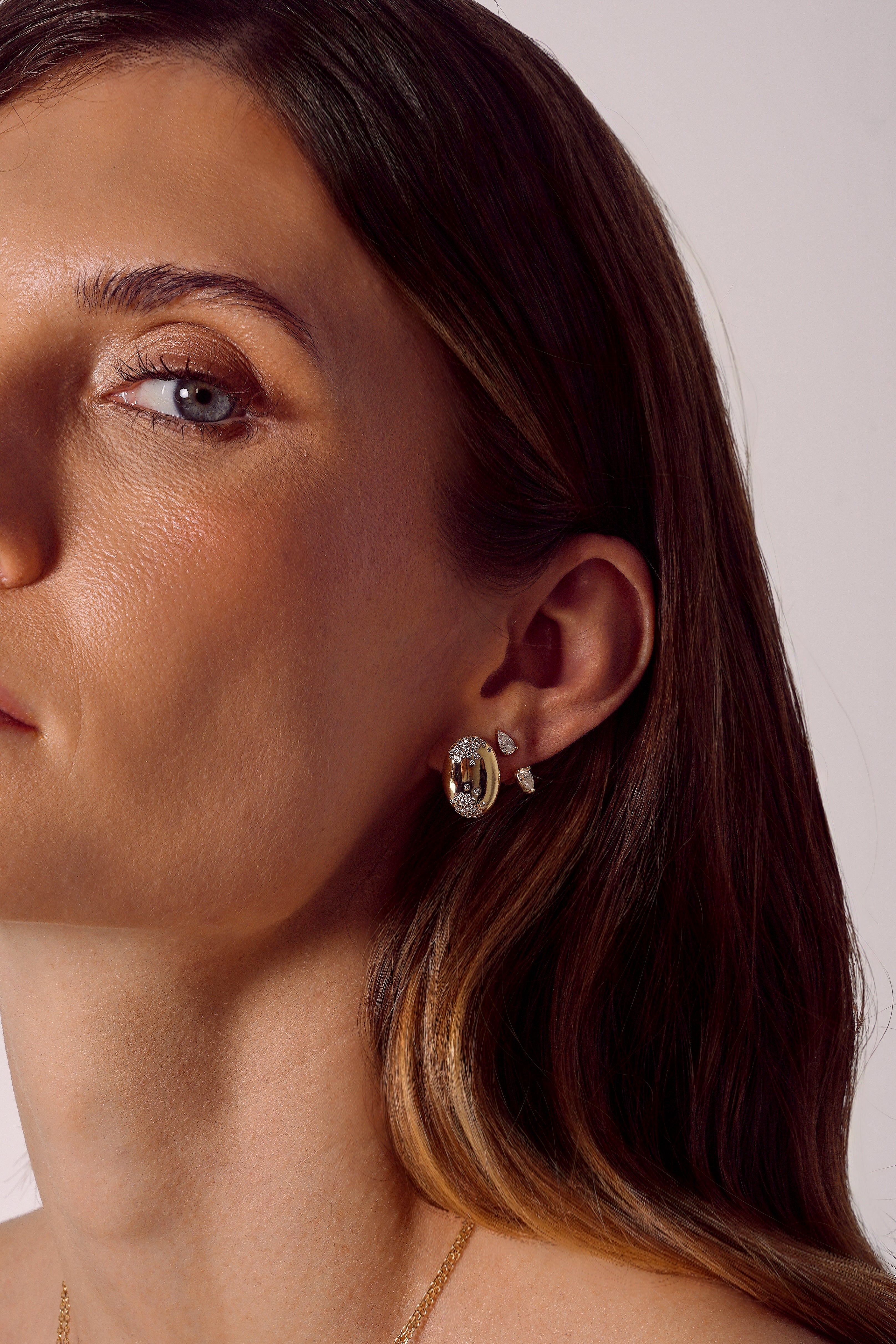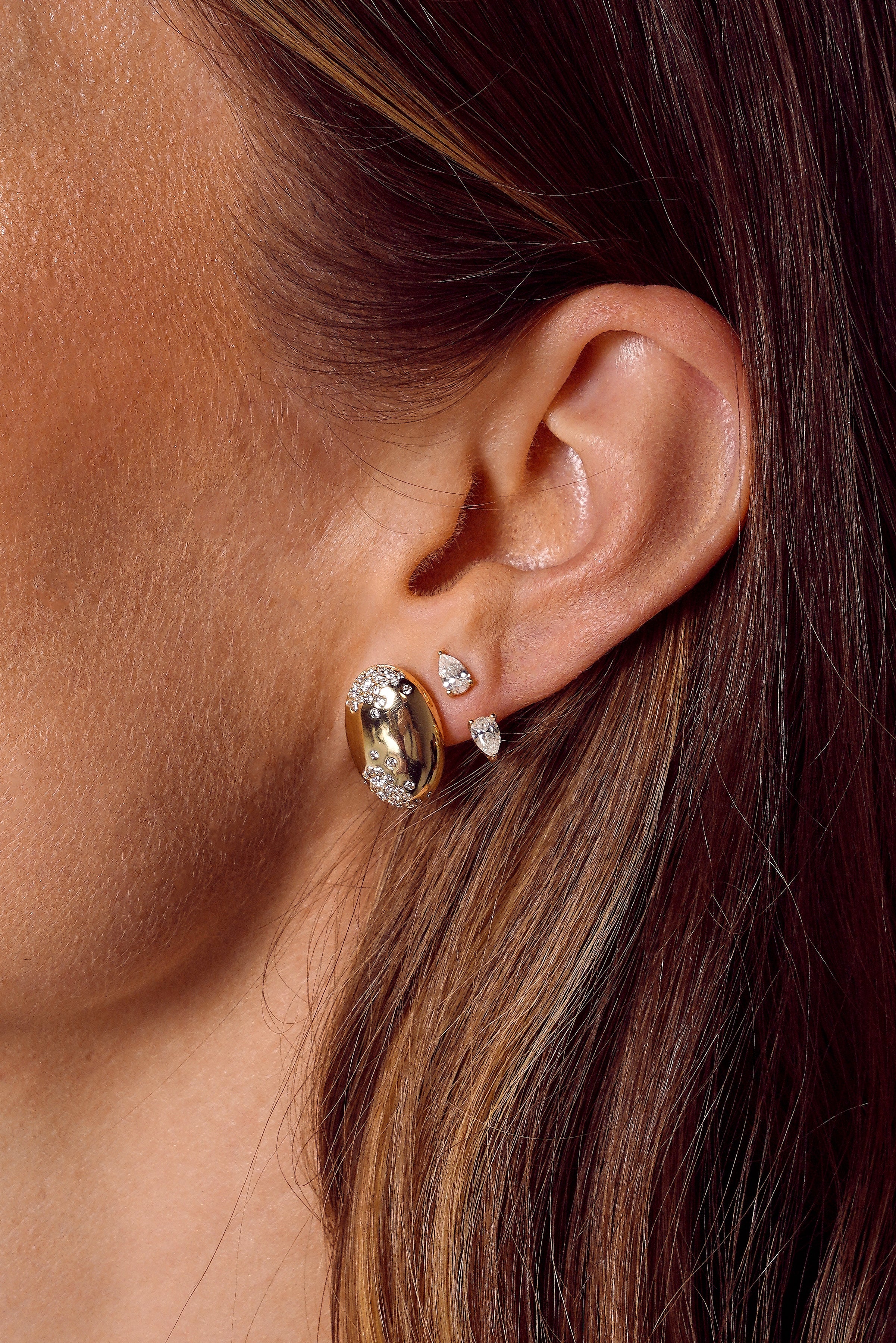 Curvas suaves, brilho luminoso — os Brincos Velvet Moissanite trazem uma elegância escultural para sua coleção de joias. Produzidos em Prata 925 e finalizados com banho de ouro 14K ou ródio, cada brinco apresenta uma silhueta abaulada e polida, delicadamente realçada por moissanites de alta qualidade distribuídas de forma sutil, criando um brilho moderno e refinado. Seu formato de 1,2 × 1,7 cm oferece presença marcante sem abrir mão do conforto, ideal para qualquer ocasião.