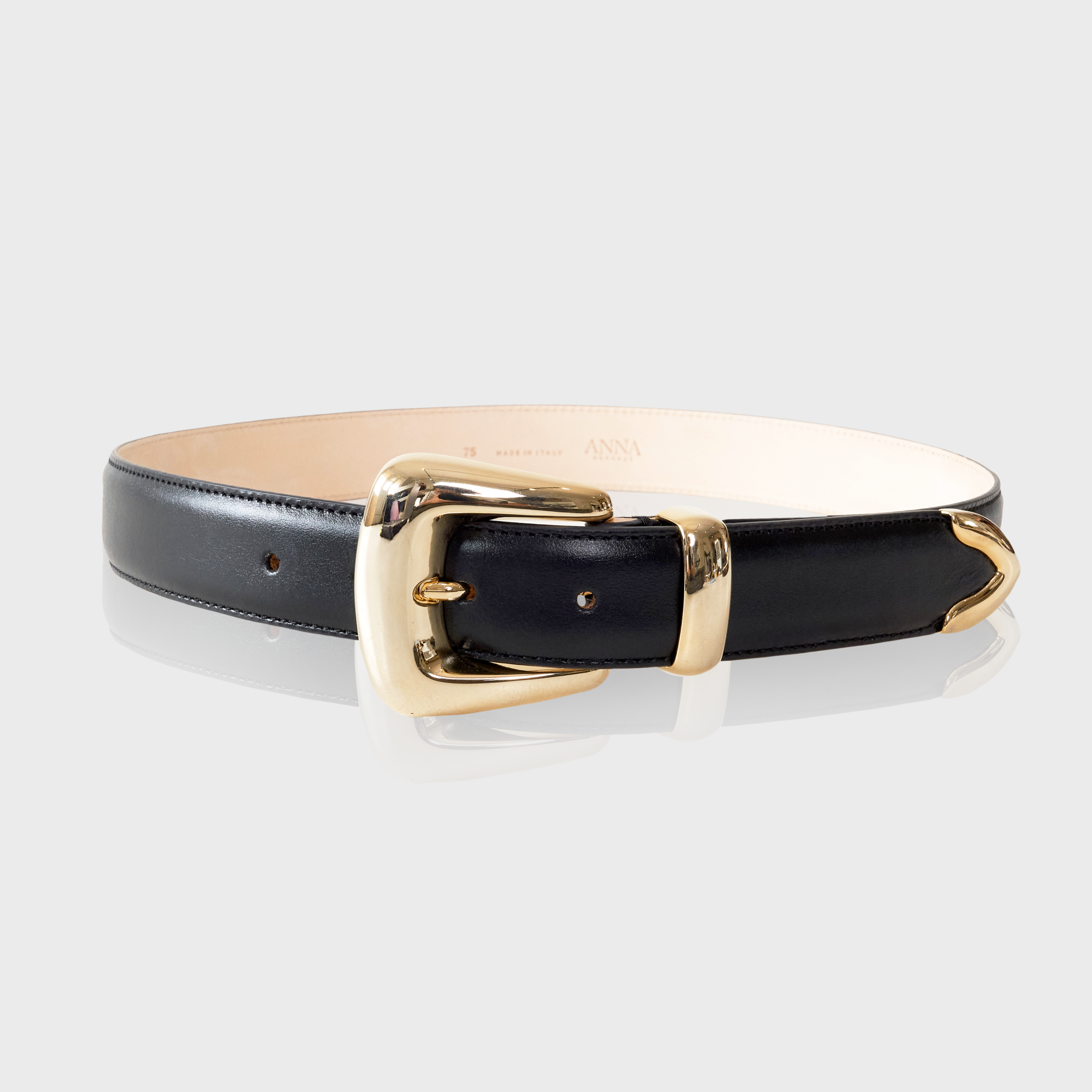 - Fivela, laço e ponta pontiaguda em tom dourado