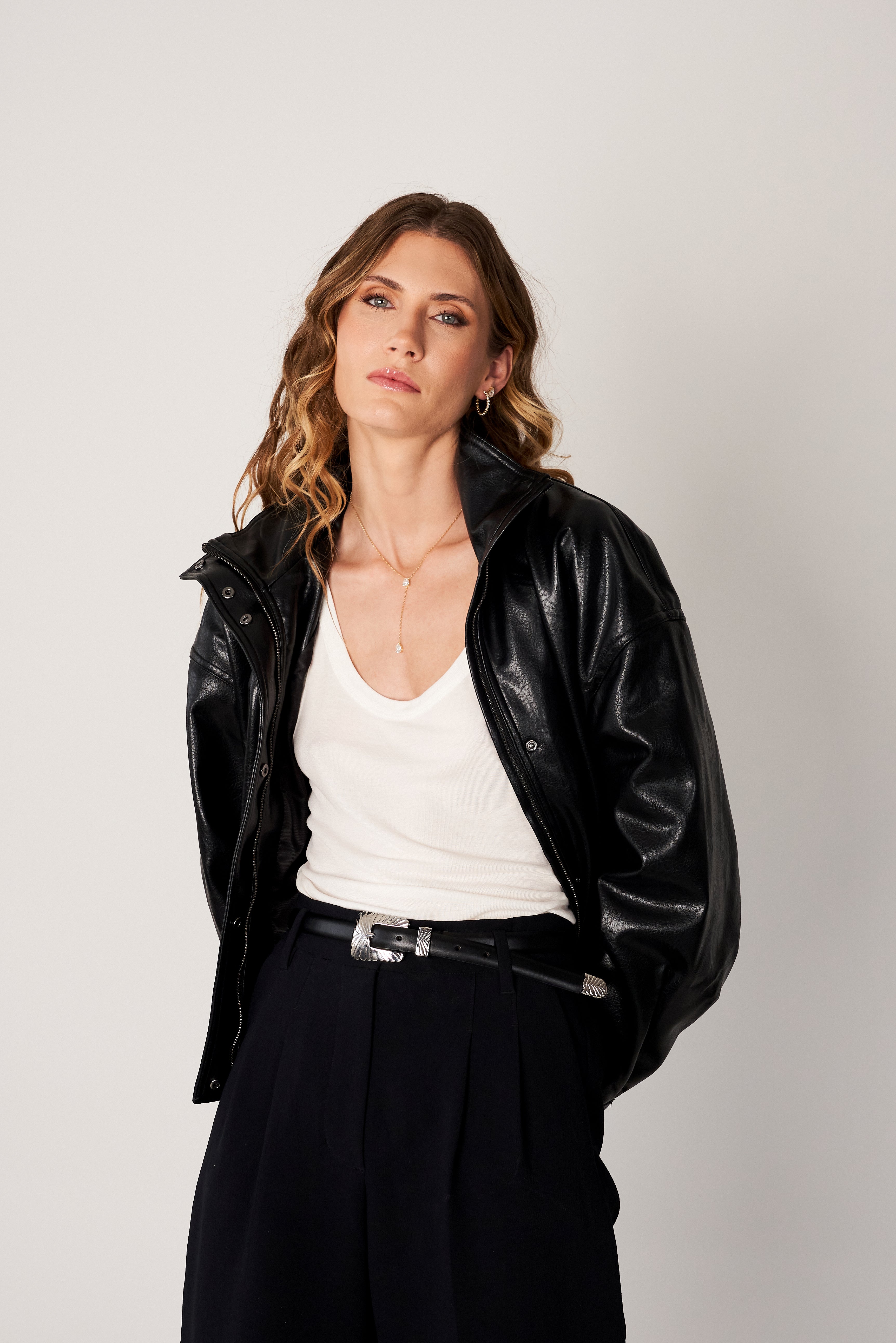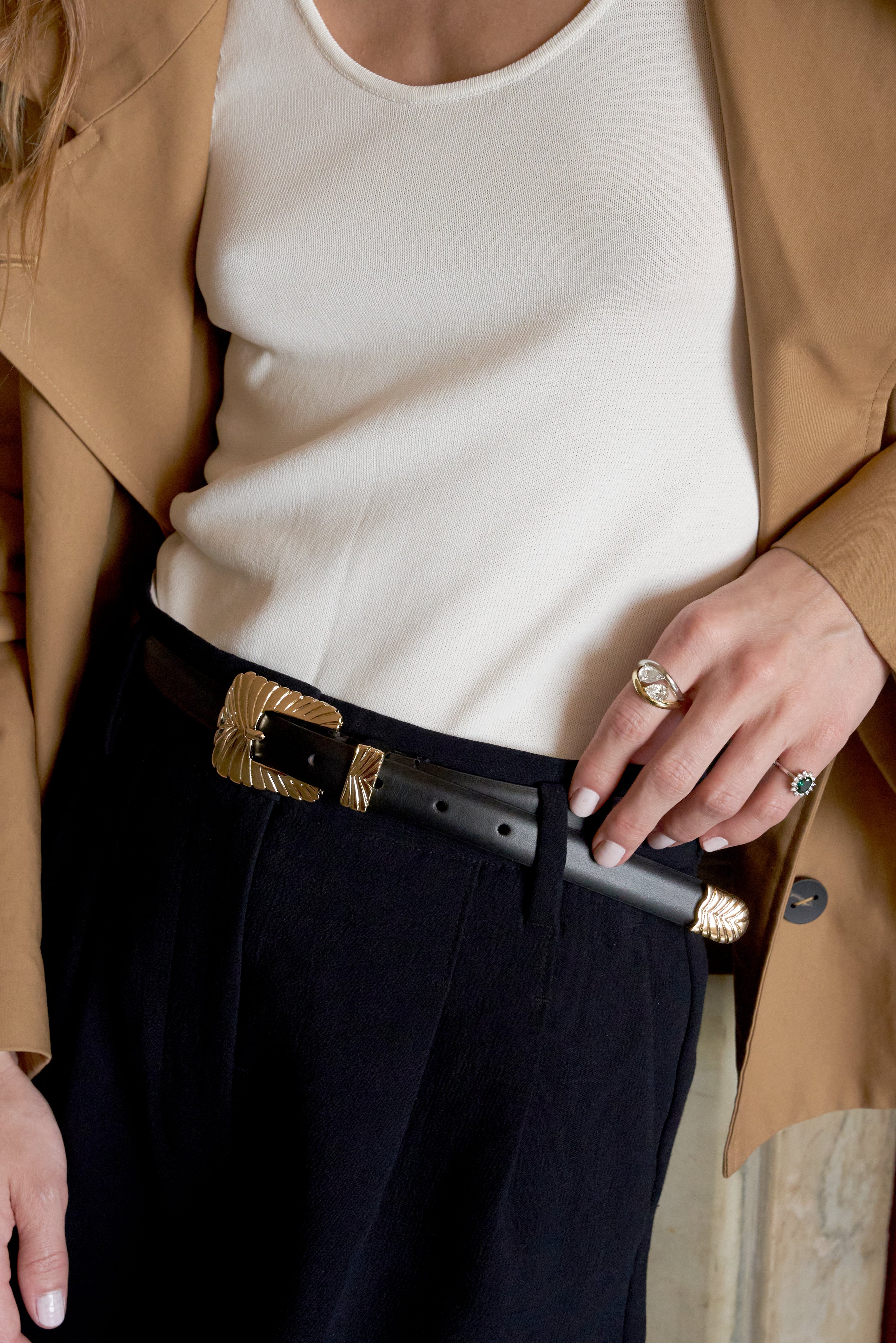 • Fivela: Fivela, passador e ponteira em metal esculpido com inspiração western, disponíveis em tom dourado ou prateado