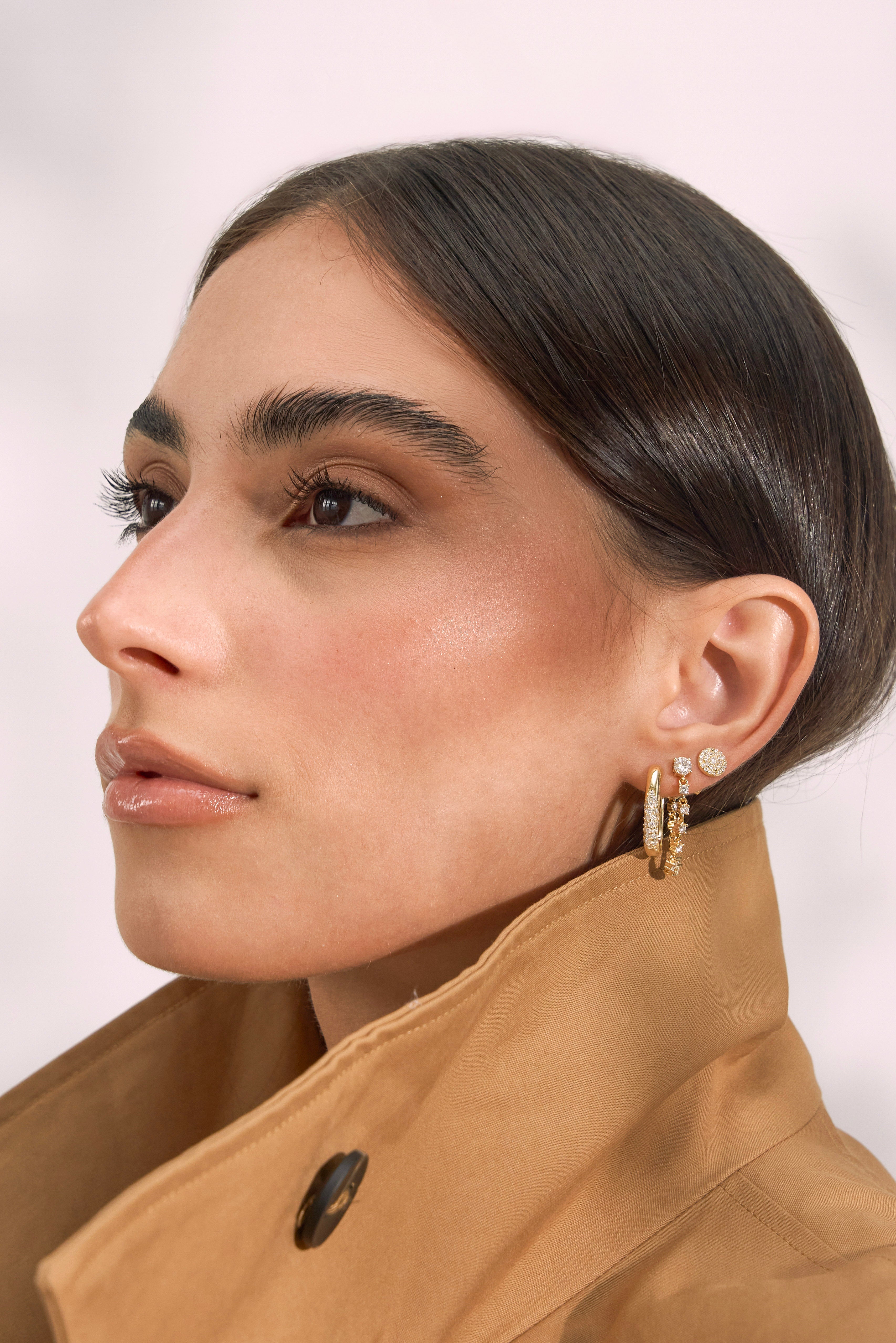 Design: Silhueta clássica de brinco redondo com superfície em pavé, criando um efeito sofisticado semelhante ao diamante sob qualquer ângulo