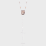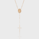 Design: Colar estilo lariat, com medalha detalhada e cruz adornada com zircônias.
