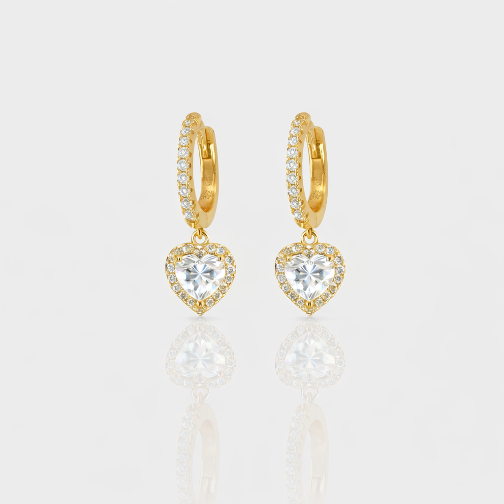 - Design: Cada brinco exibe uma impressionante pedra central em forma de coração cercada por acentos cintilantes, criando um efeito cativante