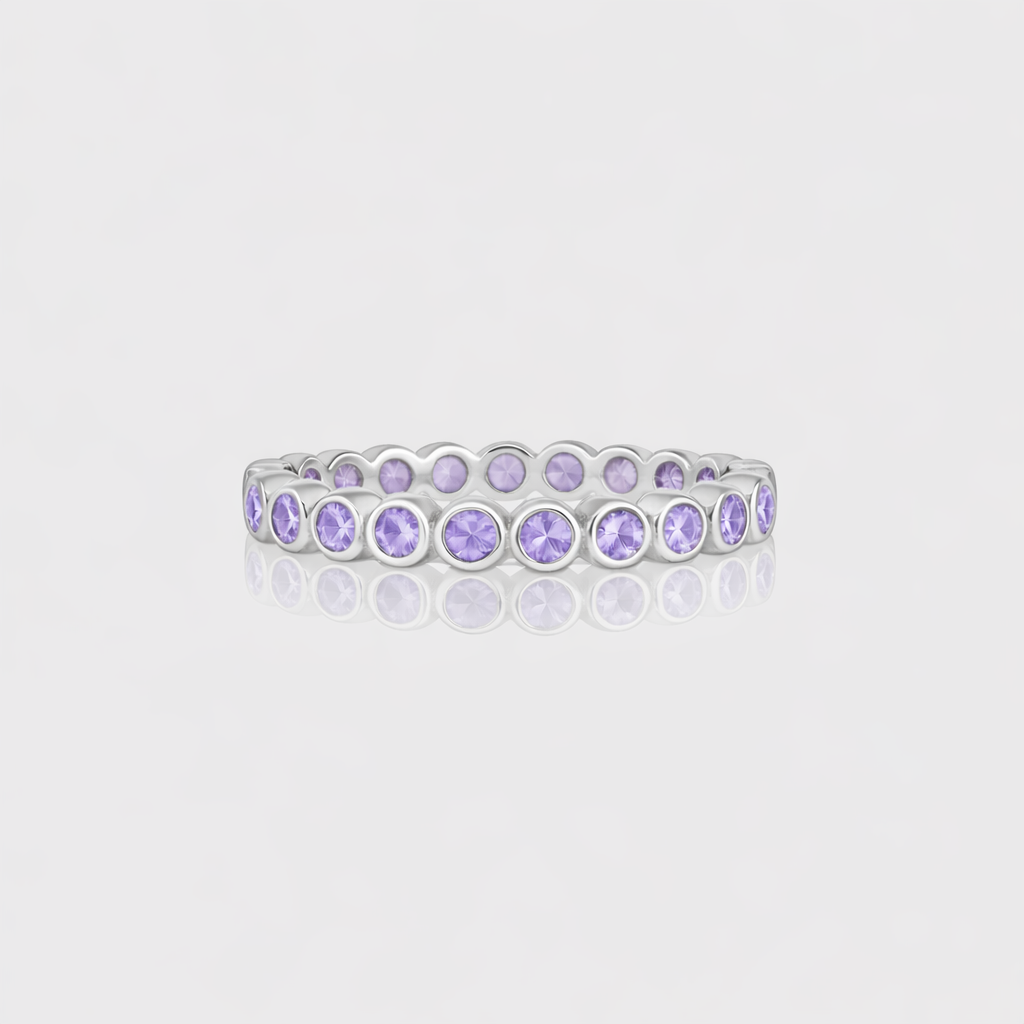 Um toque delicado de cor para o dia a dia, o Slim Amethyst Ring envolve o dedo com uma fileira luminosa de ametistas em tom violeta — perfeito para usar sozinho ou combinado com suas alianças favoritas.